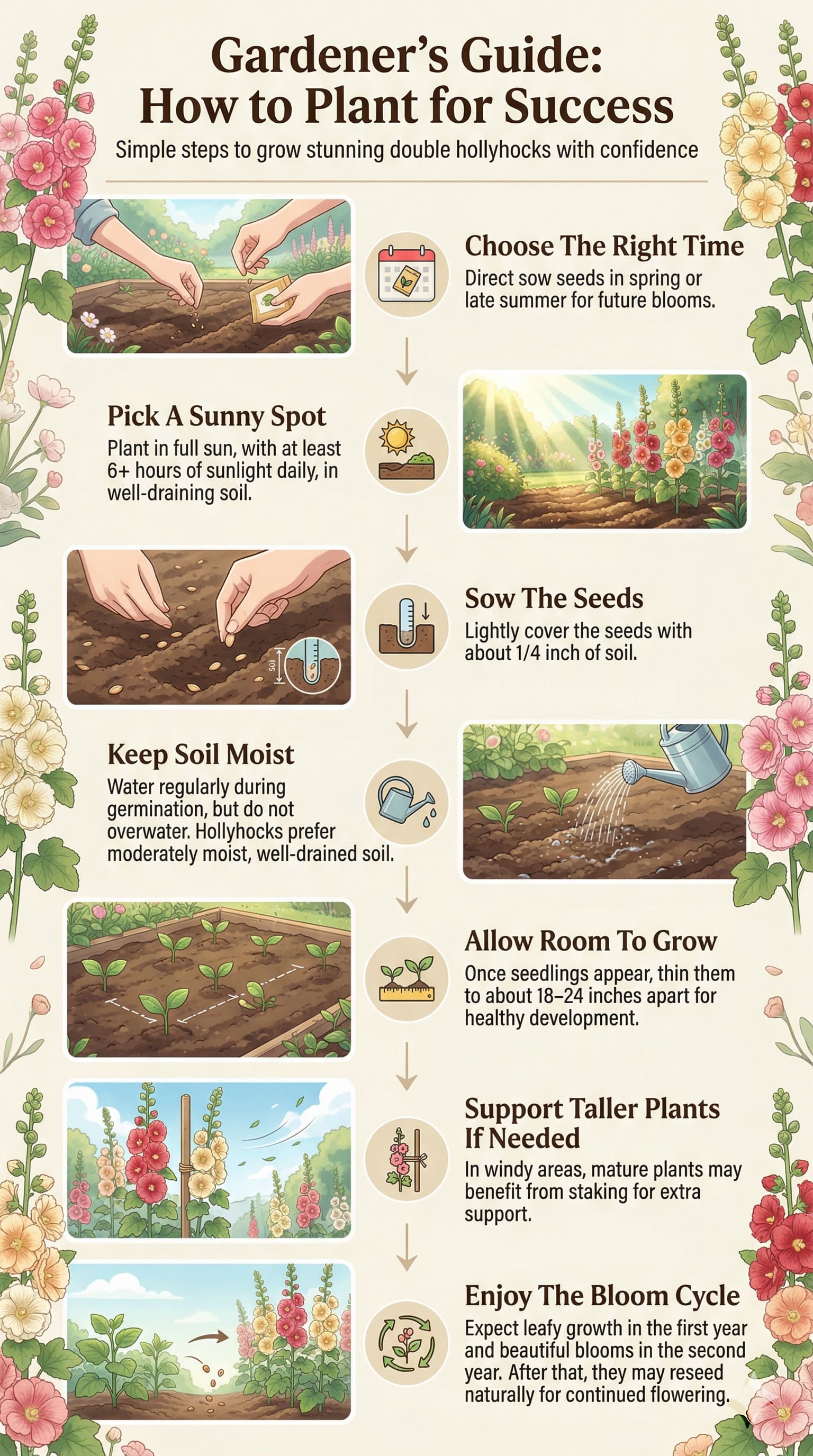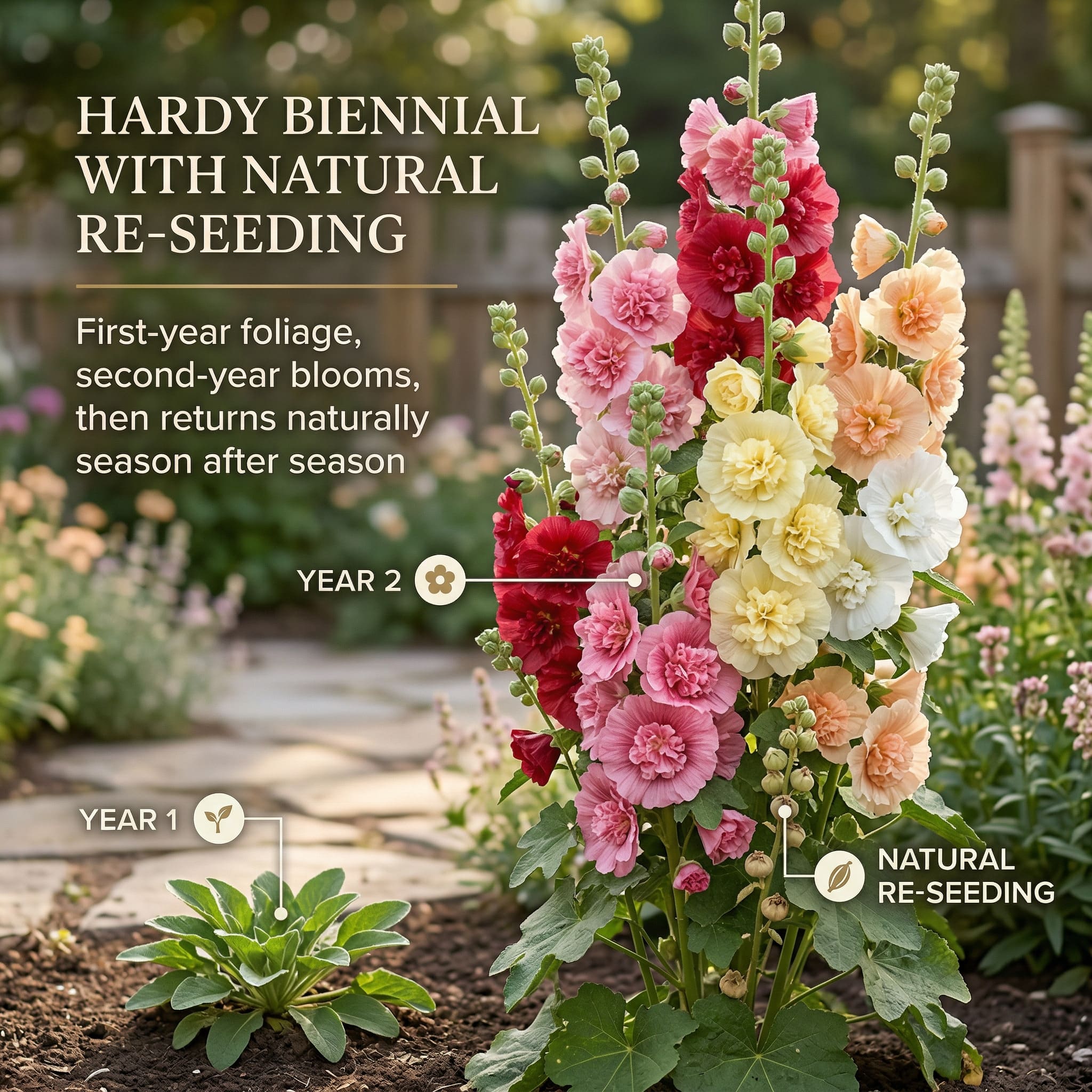 Double hollyhocks are hardy biennials, which means they typically grow foliage in the first year and bloom in the second. Once established, they can self-seed naturally, giving you continued flowers year after year with less effort.