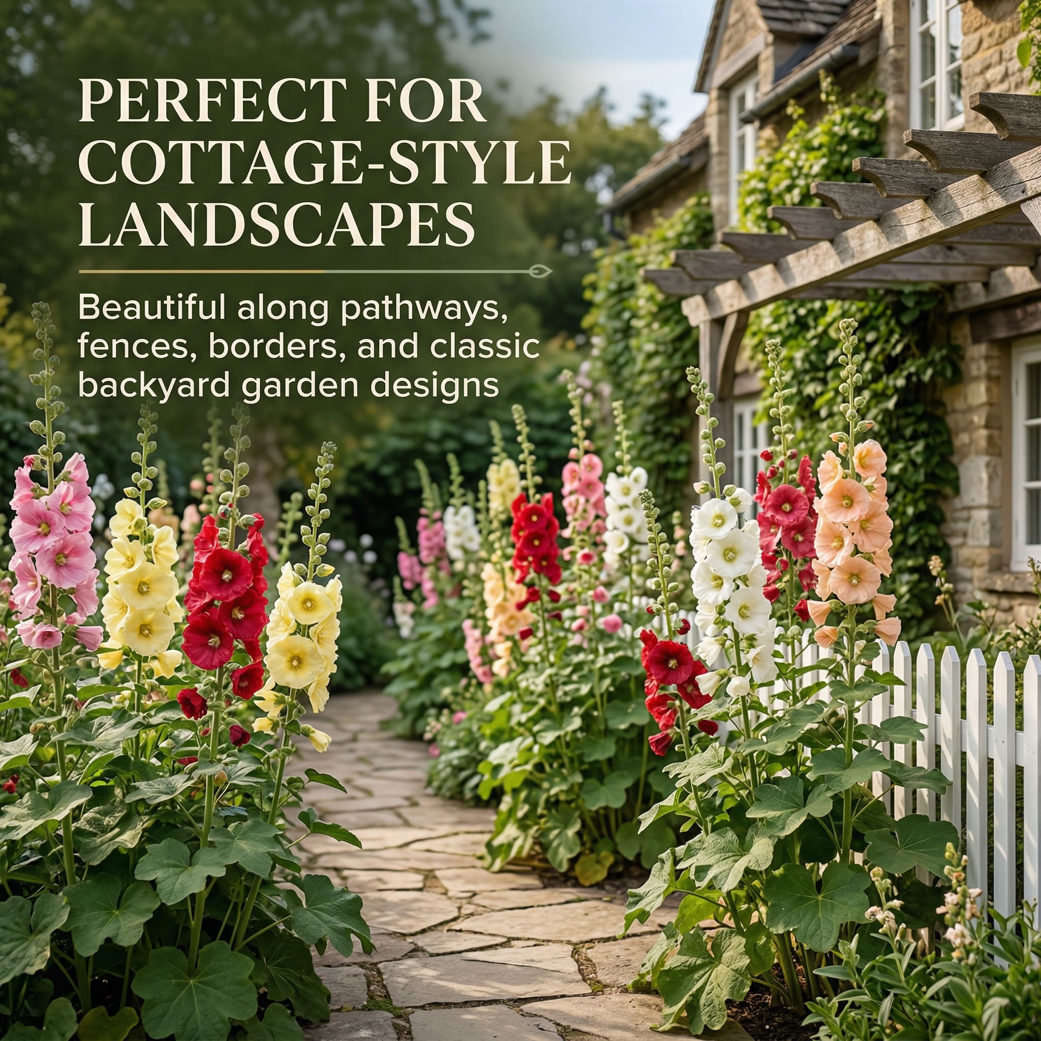 These hollyhocks can grow approximately 5–8 feet tall, adding dramatic vertical beauty to fences, walls, borders, pathways, and cottage-style landscapes. They’re perfect when you want your garden to feel fuller, taller, and more visually striking.