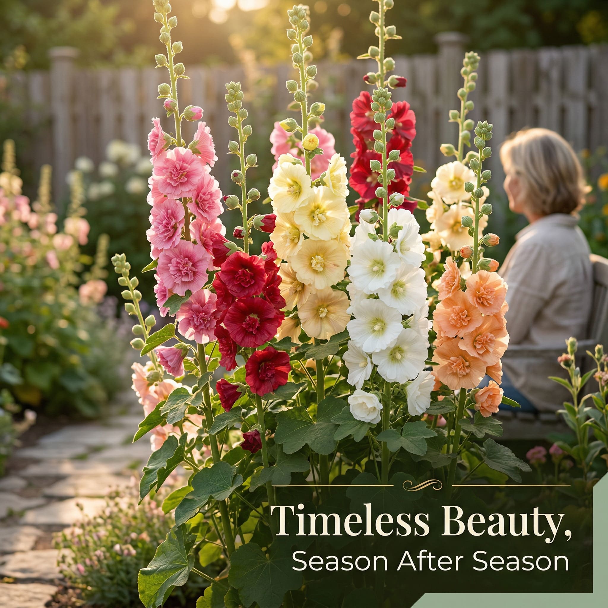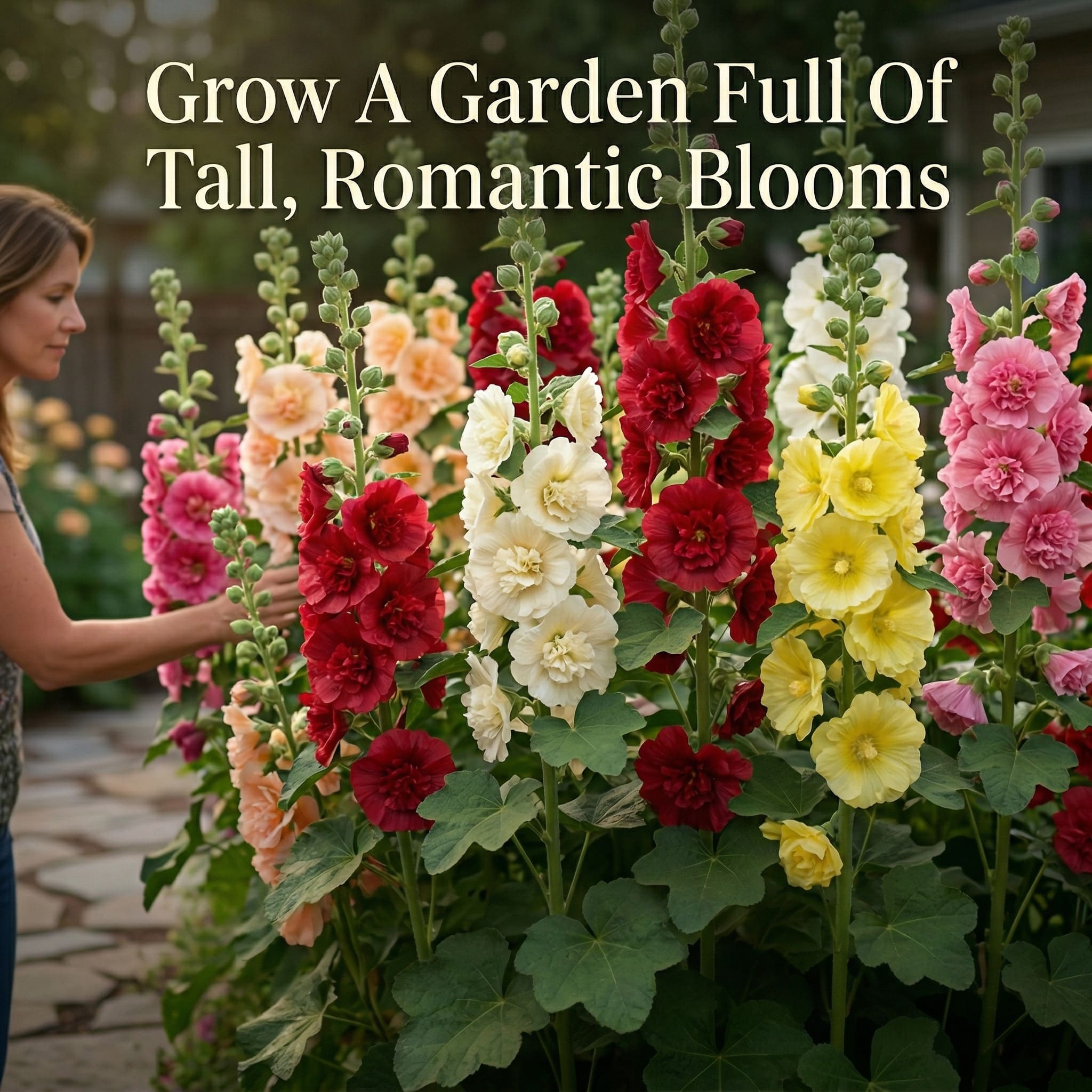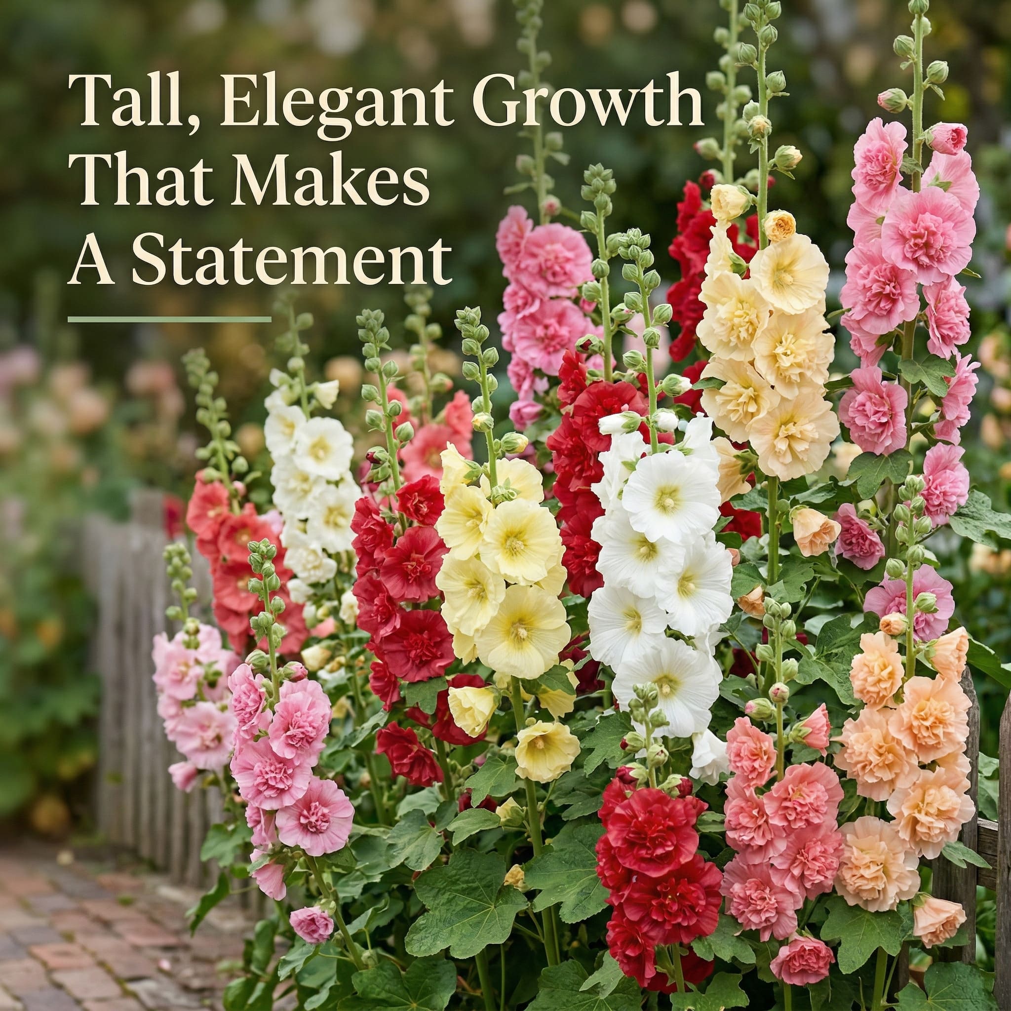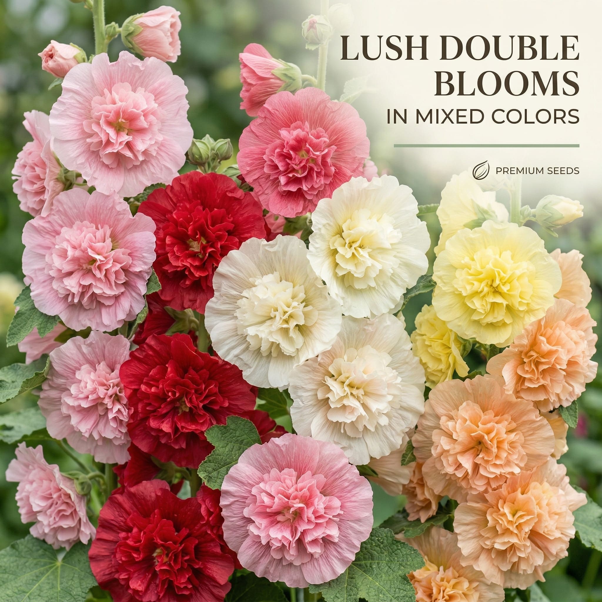 🌸 These stunning heirloom flowers grow into tall, elegant stalks covered in lush, double-petal blooms in a gorgeous mix of pink, red, yellow, cream, and white.